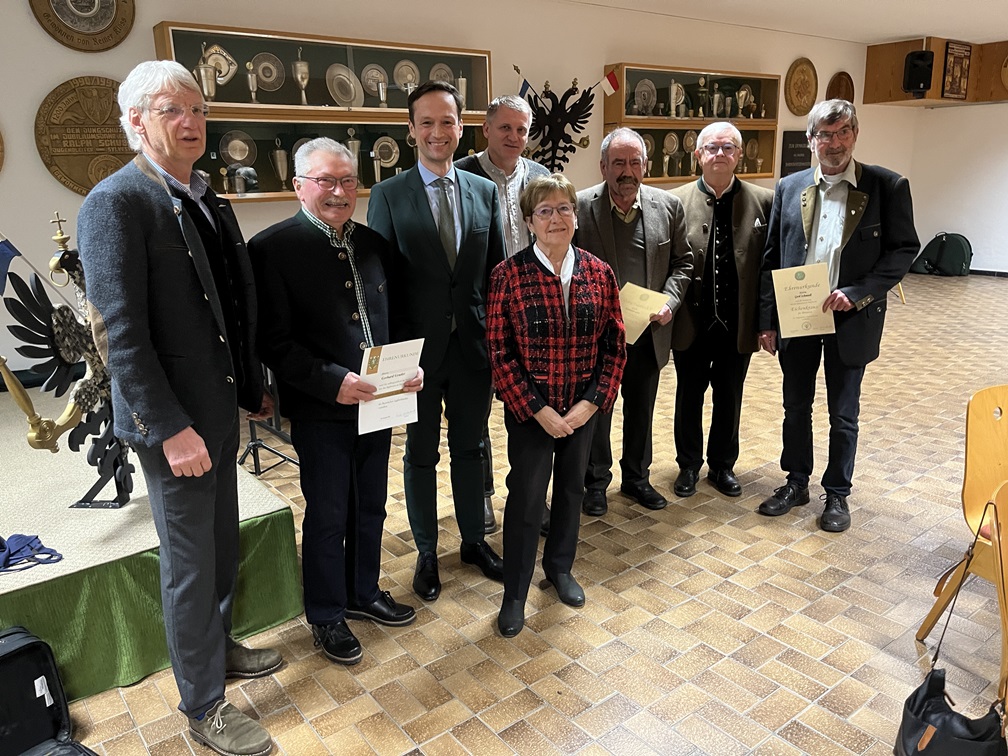 Die Ehrengäste Herr Landrat Töpper, Frau Dr. Anja Heinelt, Leiterin des Staatlichen Veterinäramtes am Landratsamt Schweinfurt, Kreisbäuerin Frau Barbara Göpfert, Herren Thiefelder und Feuchter von der Forstbehörde, Wolfgang Schmitt, Jagdberater und Herr Josef Köhler Vertreter des Jagdgenossenschaften im BBV gratulierten den Jubilaren Rudolf Ach (60 Jahre Mitglied im Verein), Ferdinand Göppner (60 Jahre) Wolfgang Schneider (60 Jahre) Werner Weidlein (60 Jahre) Walter Zeißner (40 Jahre).